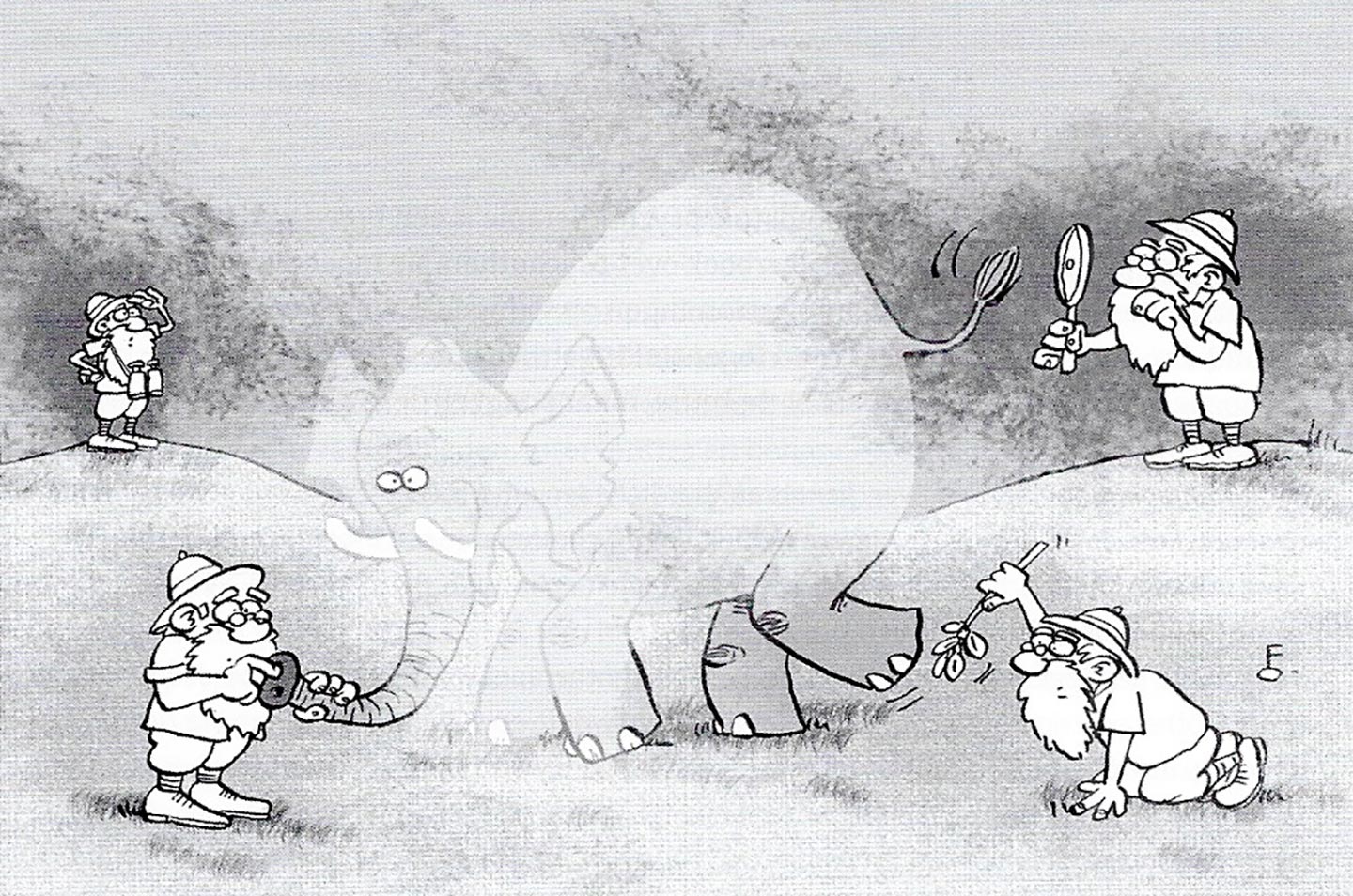 Stel, een aantal ontdekkingsreizigers zijn op grond van verhalen op zoek naar een schepsel dat ‘olifant’ wordt genoemd. Ze dwalen door de altijd aanwezige mist in het gebied waar deze olifant geacht wordt voor te komen. Plotseling, vrijwel tegelijkertijd, ziet ieder van hen een stukje onbekend schepsel uit de mist opdoemen. De een ziet een zware, eeltige, op de grond staande zuil met iets wat op nagels lijkt. De ander ziet uit de mist een soort slang naar beneden hangen met gaten aan het ondereinde. Een volgende ziet hoog in de mist geen slang hangen maar een soort touwtje met een kwastje. Enz.